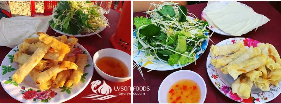 Bạn cũng có thể sử dụng chả cá Đỏ Lý Sơn để làm món ram chả cá(chả giò): tương tự khi mua về bạn nhớ rã đông chả trước sau đó cho chả ra tô rồi quết đều, có thể trộn thêm một ít hành tím băm nhuyễn để ngon hơn. Bạn dùng bánh tráng mỏng, loại bánh tráng đặt biệt dùng để gói ram chả có xuất xứ từ Quảng Ngãi(shop có bán), thường loại bánh tráng này có kích cỡ hơi lớn nên bạn hãy cắt 1 bánh như thế thành 6 phần điều nhau. Bạn dùng thìa lấy từng phần nhỏ chả cá cho vào phần bánh tráng đã chia rồi cuộn tròn, thường 0,5kg chả cá sẽ cuộn được 20 cuộn ram chả như thế. Bạn cũng cho dầu vào chảo, phi dầu chín trước, thả từng cuộn chả vào chảo dầu, trở đều cho đến khi cuộn chả có màu vàng như bên dưới là được, tương tự như chả chiên, món này cũng ăn nóng mới ngon.