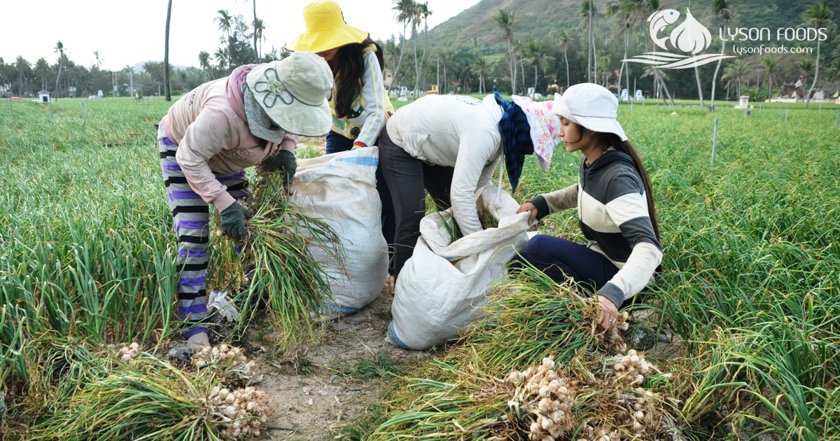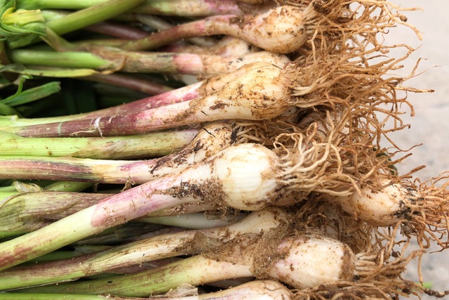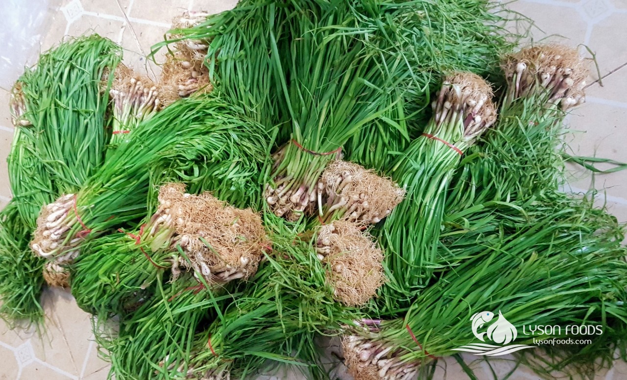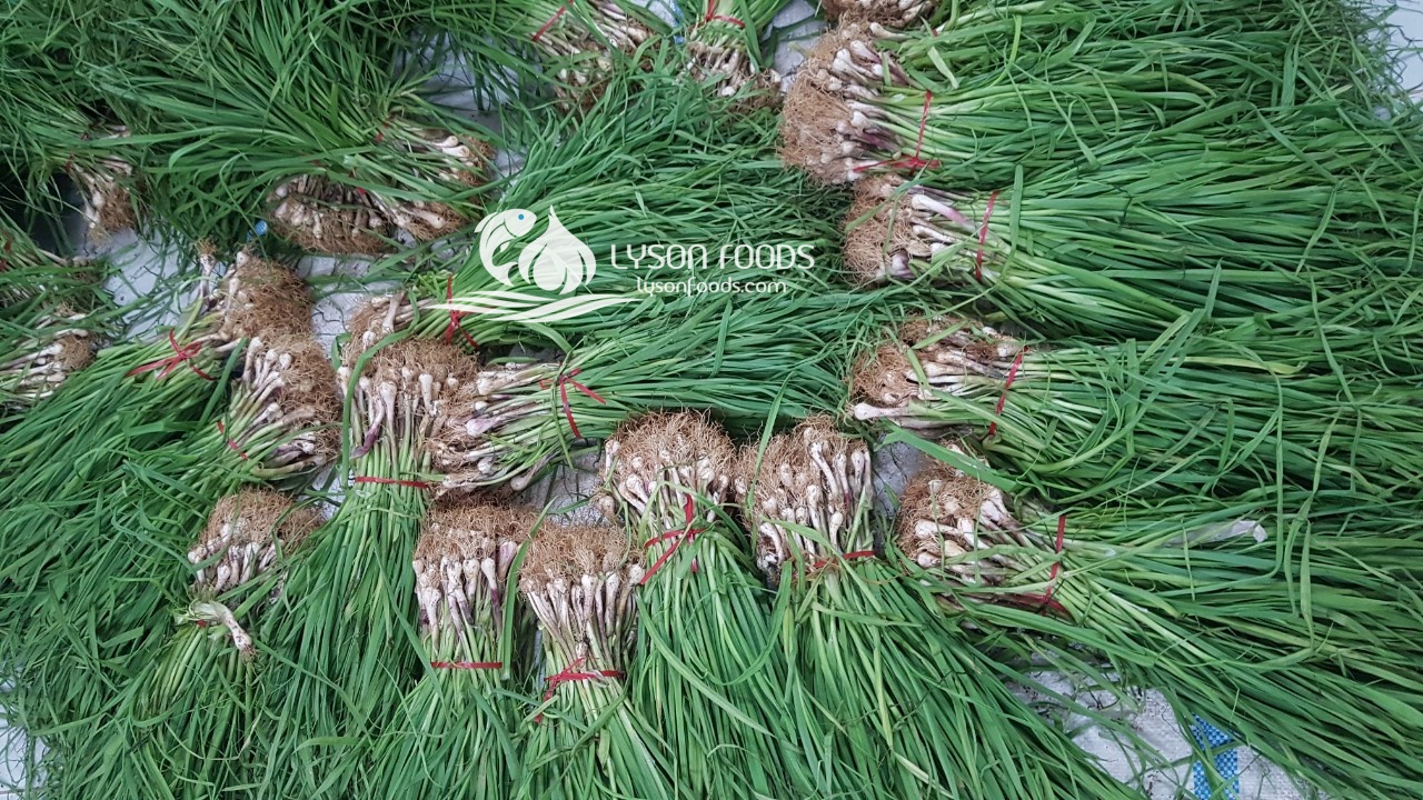 Cây tỏi non được thu hoạch sau đó cắt bỏ phần ngọn, chỉ lấy phần củ và gốc dài khoảng 10 cm